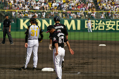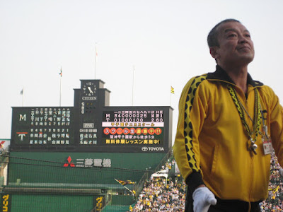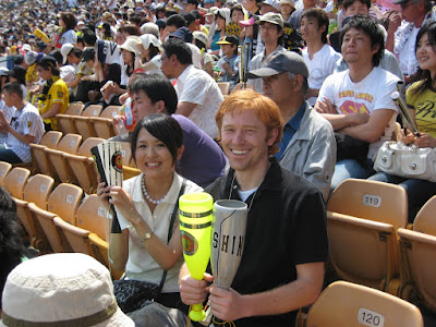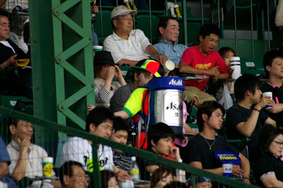 The Hanshin Tigers is the team I went to see. Hanshin is actually a Japanese company. In Japanese Baseball the team is named after the company. So it would be like the Ford Tigers, or the Walmart Red Sox. Kind of lame, but anyway... The Tigers are in the Central League. Japan has two leagues the Central and Pacific. The Central league has no DH, the Pacific does. Each leauge has 6 teams. In the Central league is the Hanshin Tigers, and the Yominuri(Tokyo) Giants. I've mentioned here before that Tokyo and Osaka as cities are huge rivals. Well it carries over into baseball as well. The Giants are the Yankees of Japanese baseball for sure. They have the biggest payroll, the best record of championships, and they play in the biggest city. What does the make the Tigers? Most people compare them to the Red Sox. They are the lovable losers, who usually don't win that many games. But they still have ton's of fans all over the country.