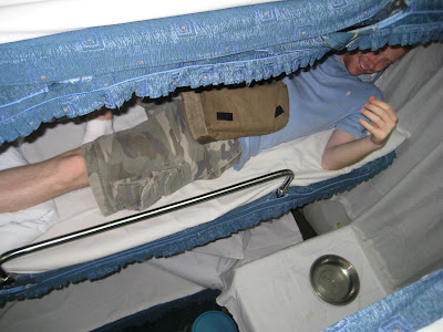 We get on the train, we have a bunk to sleep on. Its called a hard sleeper. I'd say its a room about the size of your average American bathroom. With 3 bunk beds on each side. Its cozy so I don't really mind it.