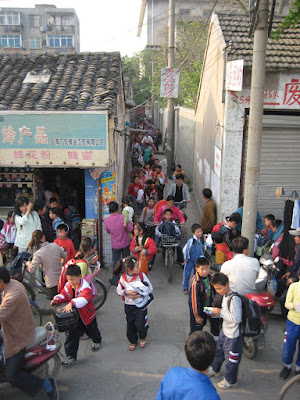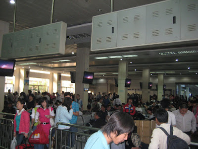 We made a stop in a small town called Suzhou (I think). In Japan, if I want a ticket, I walk up to a machine, put in my money, and buy the ticket. In China I go to a huge ticket office, which consists of 30 lines each with about 100 Chinese people waiting in each one. Robbie and I wait in line for 15 minutes at the counter that says "English Ticket purchasing". It closes when we are 2nd in line. We run over the other English line and finally get our tickets.
